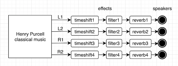 timeshift - short delay of the channel, delay time is variable from 0 to 200ms filter - low pass filter with variable cutoff frequency reverb - hall reverb with variable decay, diffuse ans dry/wet amounts