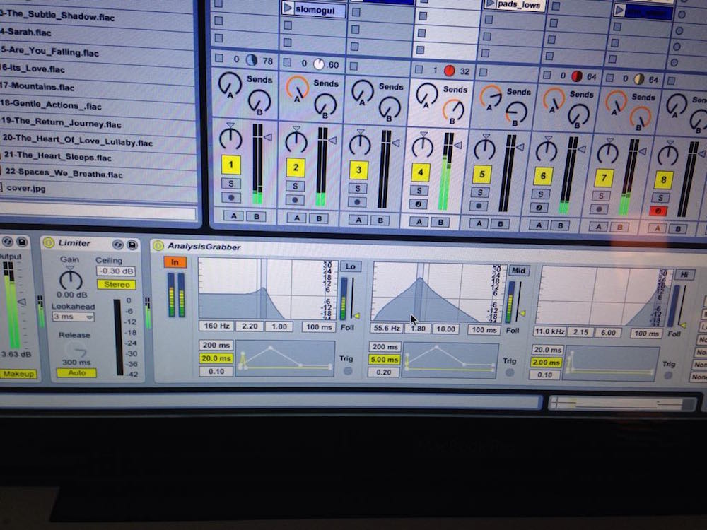 The set consists of two laptops. The first one "audio" is playing music live and each audio track data is analysed with livegrabber plugins. Each track can be analysed for amplitude changes in low mid and high frequencies. All this data can be separately sent using OSC to second "video" laptop. This allowed us to make the video image responsive to changes in music.